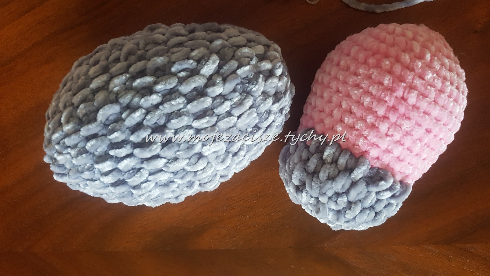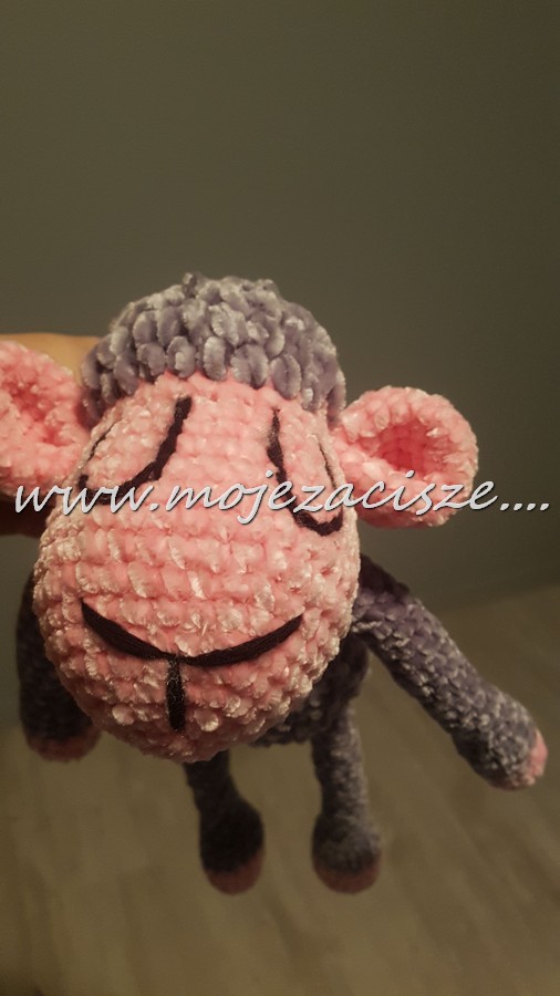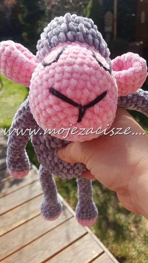 A że szydełkowe czarne owieczki pasują bardzo- to szybciutko zrobione z ciemno szarej mięciutkiej chenili z różowymi mordkami. Wypełnienie kulka silikonowa można prać w pralce. Wykonanie nie było trudne bo już kolejny raz .