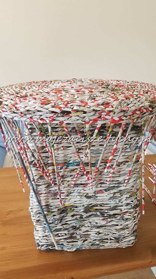 Do wykonania rurek wykorzystałam lokalne papierowe oferty . Stabilności stolikowi doda pozostawiony w środku karton. Rurki wyplatane wzorem ósemkowym. Dla przedłużenia żywotności mebelka trzeba go polakierować bezbarwnym lakierem albo farbą . Ja swój zostawię niepomalowany bo wg mnie ma swój urok taki właśnie gazeciany . Od spodu dokleiłam zakrętki z plastikowych idealne sprawdzą się jako nóżki i papier od spodu tak szybko się nie zniszczy.